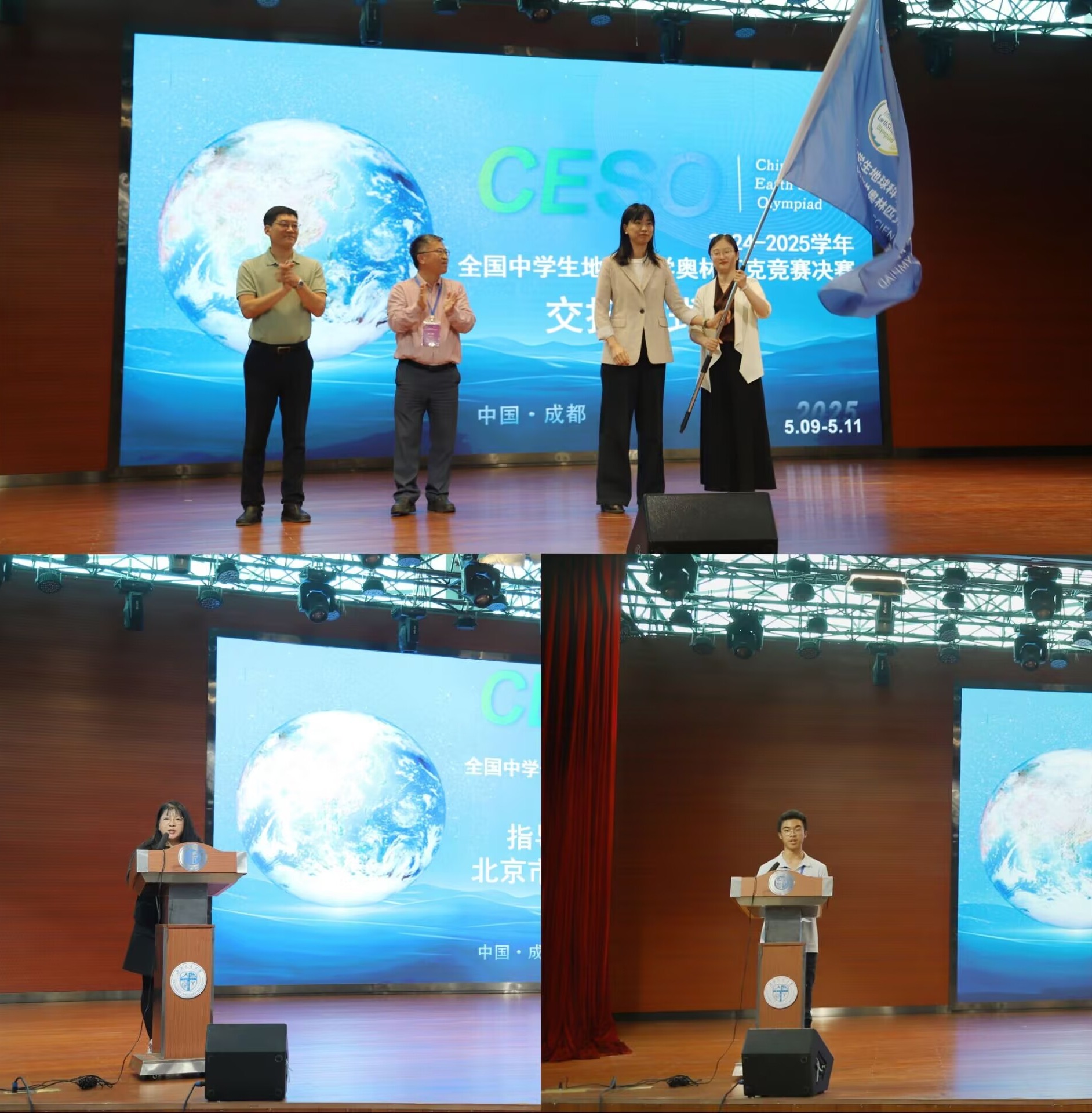 现场举行下一届全国中学生地球科学奥林匹克竞赛决赛交接仪式,中国海洋大学海洋地球科学学院团委书记张婧、青岛第二中学地球科学奥赛首席教练邓娜,从李小军、蘑菇视频