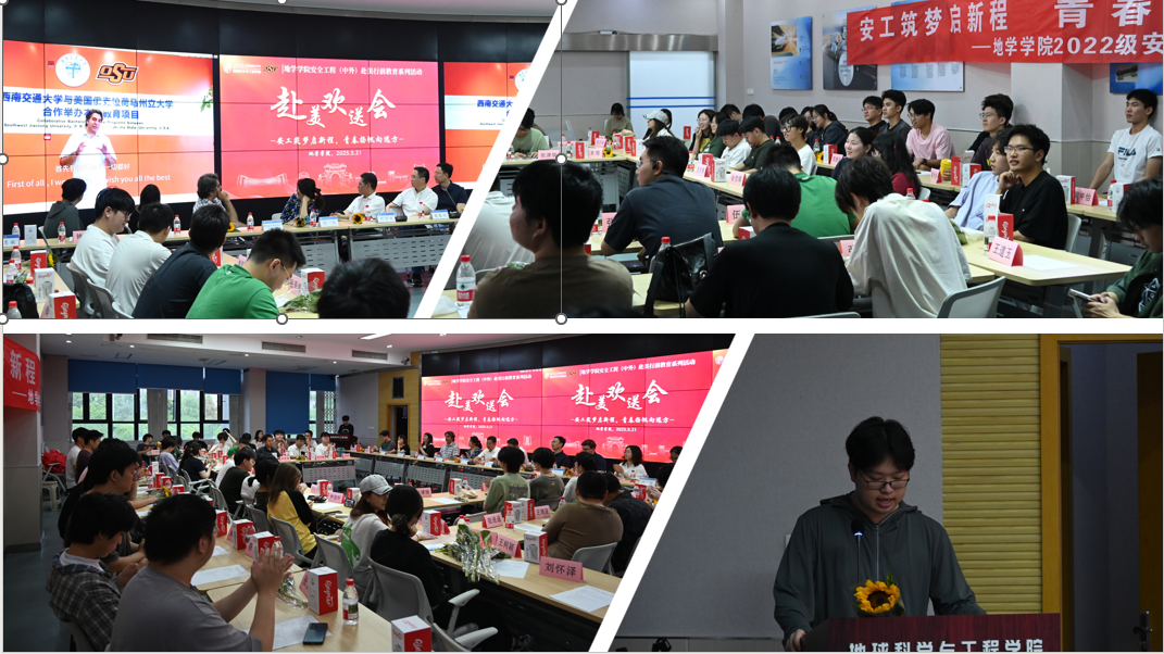 犀浦校区的榕树在暖风里舒展着新叶,一场满载祝福与期许的欢送会,就在这酝酿着丰收与离别的时节,于校园里悄然拉开帷幕。2025年5月21日晚7点,2022 级安工出国系列活动之 “安工筑梦启新程,青春扬帆向远方” 赴美欢送会在X4243举行。党委书记关秦川、院长刘国祥、党委副书记郑波、合作办学项目主管关方、项目教学主管刘静、专任教师 Ehsan Naderi Kalali 、Jamie F. Townsend ,以及项目部的郑容、陈茜、牛小会、干敏,辅导员孙惠敏以及22级安全工程(中外)全体同学参与本次活动。本次欢送会由22级安全工程(中外)专业学生马健迅主持。