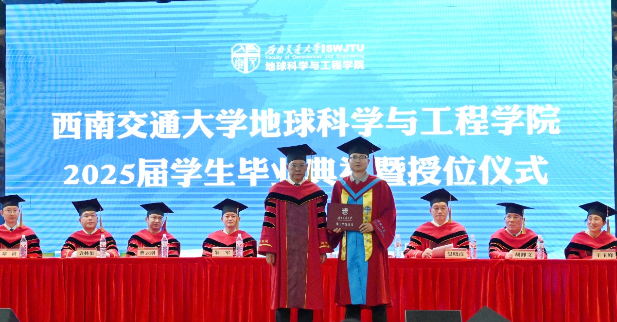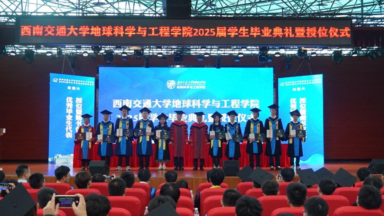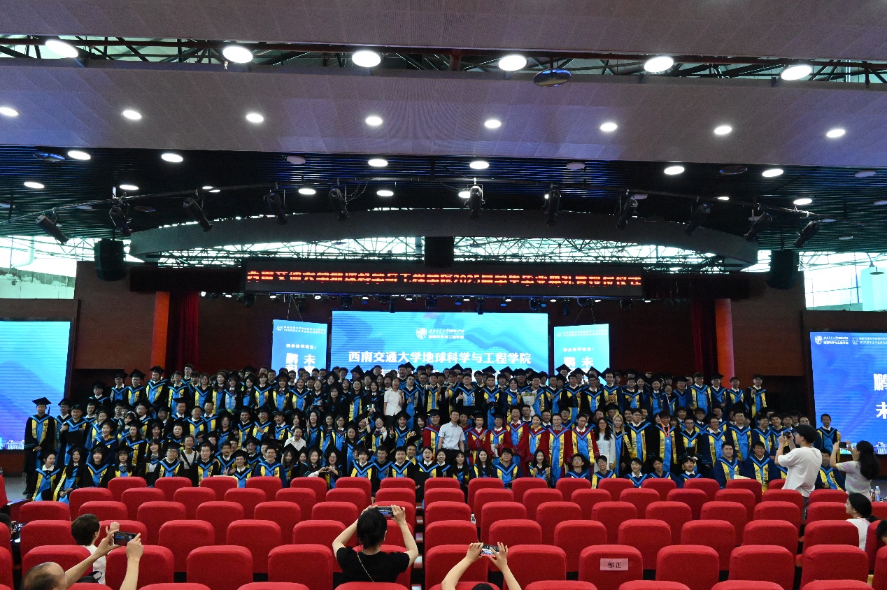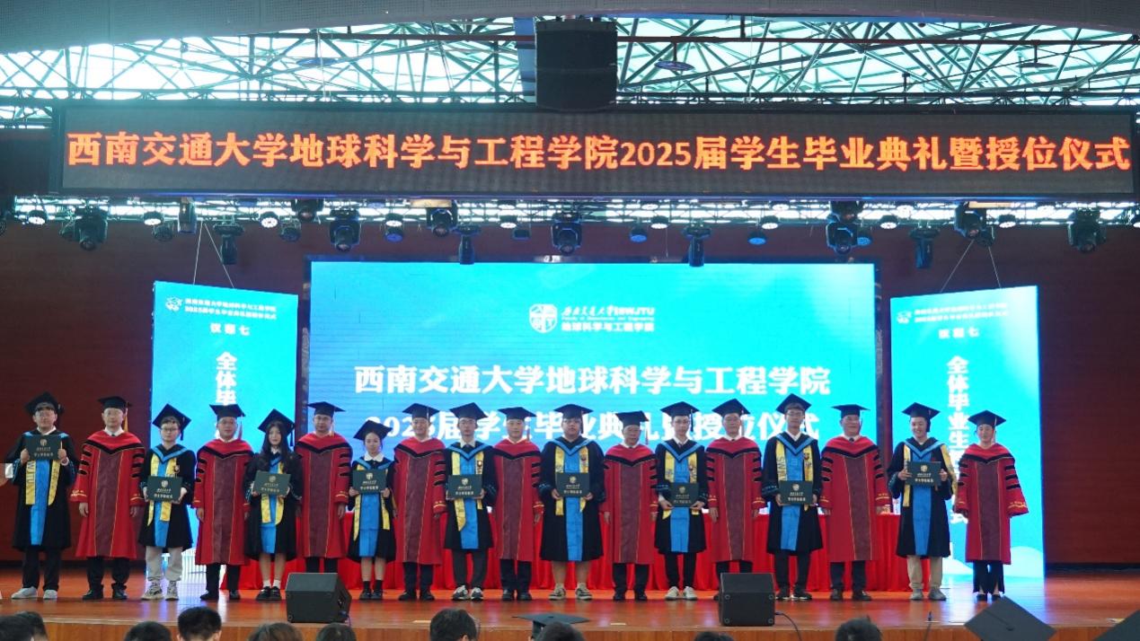 2025届学生毕业典礼暨授位仪式圆满结束后,同学们与毕业班辅导员老师一同上台,在“地学英才,引航未来”“竢实扬华,自强不息”的口号声中留下了青春大合影。祝愿2025届全体毕业生在人生的新赛道上,心系“国家事”,肩扛“地质责”,手执“测绘笔”,胸怀“消防志”,以专业所学服务时代所需,以青春之我筑家国之梦,跑出属于交大地学人的加速度,在广阔天地中绽放属于自己的光彩!
