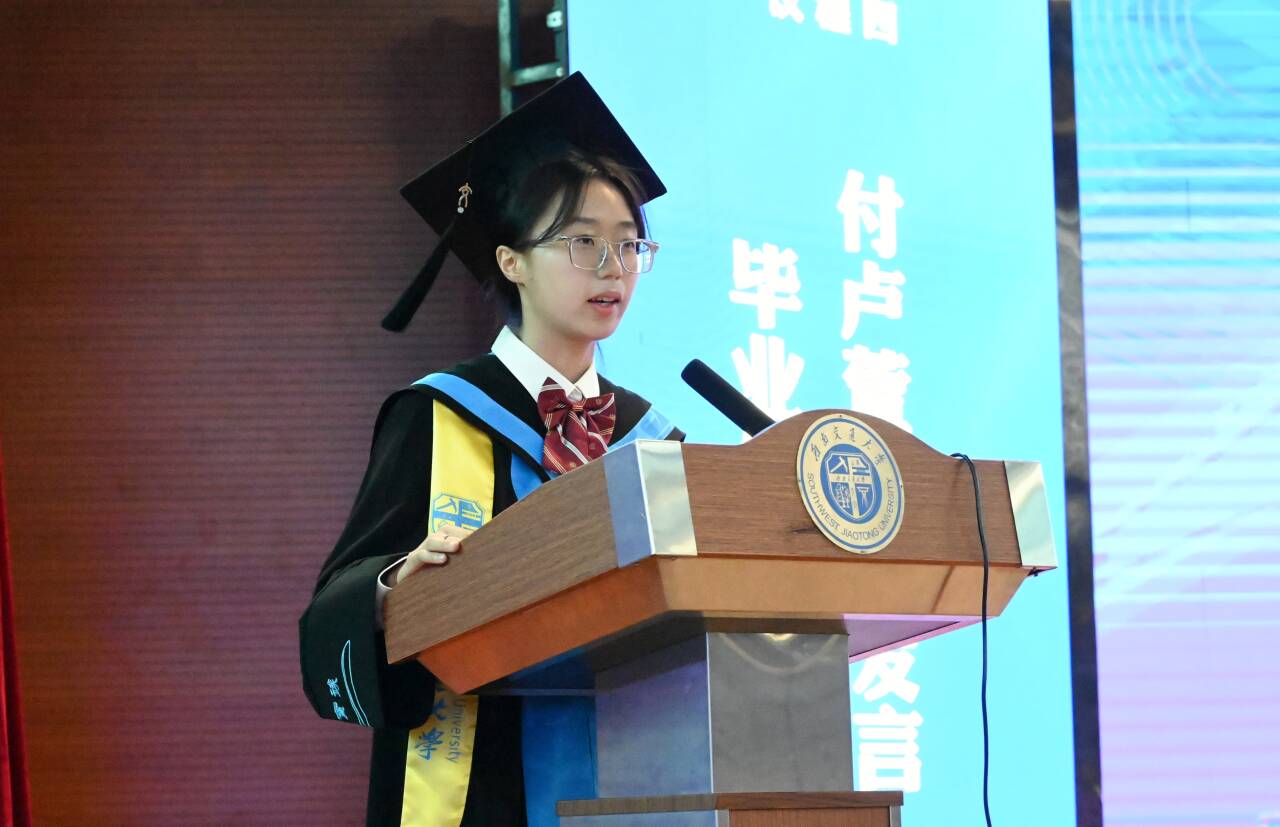 2021级测绘茅班付卢萱作为学生代表发言。她分享了个人在交大地学的成长历程与感悟。作为即将开启新征程的毕业生,付卢萱同学表示,毕业不是终点,而是站在更高处瞭望世界的起点。她号召同学们永葆“敢挽桑弓射玉衡”的锐意,带着“脚踏实地,丈量山河”的初心奔赴山海,在各自所在的领域写下属于地学英才的时代答案。