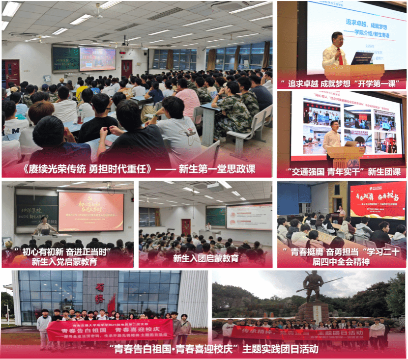 心有所信,方能行远,学院以思想铸魂筑牢精神根基,以家国情怀凝聚奋进力量,为新生勇担时代重任锚定方向、筑牢底气。一是强化思政课程引领,组织全体新生集中观看《赓续光荣传统 勇担时代重任》新生第一堂思政课,在开学典礼上以“追求卓越 成就梦想”为题讲授开学第一课,厚植爱国情怀、明确时代使命。二是深化主题教育实践,开展“交通强国·青年实干”新生团课、入党入团启蒙教育,结合中国人民抗日战争暨世界反法西斯战争胜利80周年等重要节点,举办系列主题教育与团日活动,引导新生传承红色基因、勇担民族复兴大任。