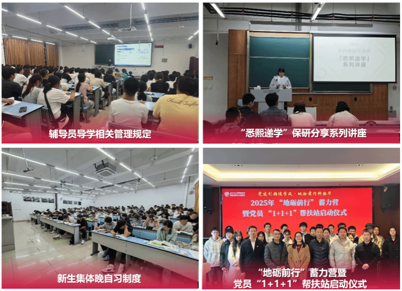 本科生学籍管理规定》等规章制度,重点警示考试作弊、学术不端等底线行为,树立严谨治学态度。三是发挥榜样引领作用,邀请优秀保研学子开展“悉熙递学”系列讲座,围绕保研路径、学科竞赛、科研入门等内容传经送宝。四是健全培养机制,推行集体晚自习制度并强化纪律检查,开展“地砺前行”蓄力营,联动党员力量对学业困难新生开展“1+1+1”精准帮扶,确保无人掉队。