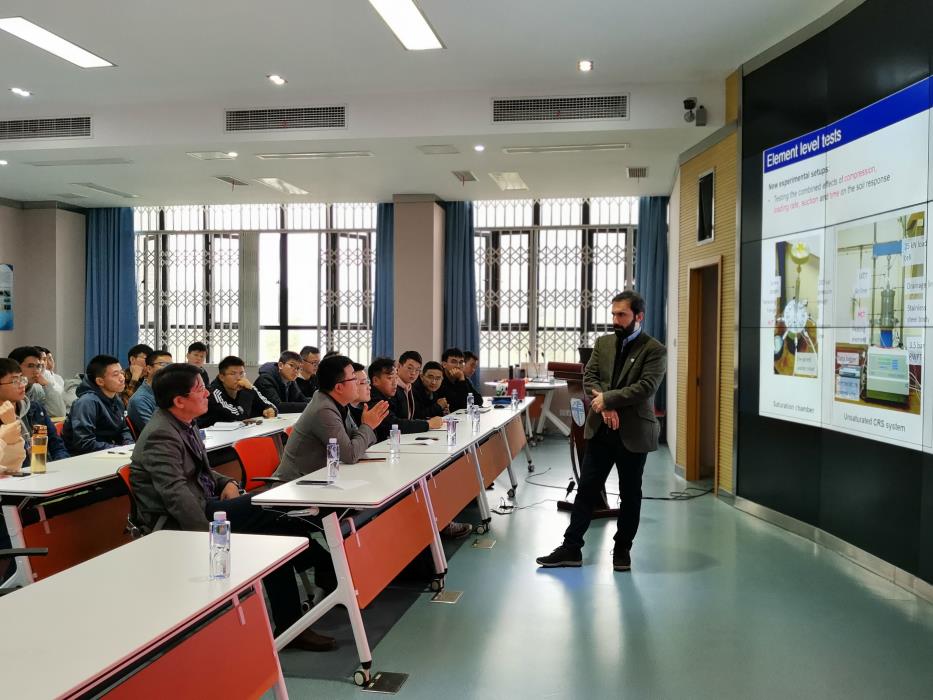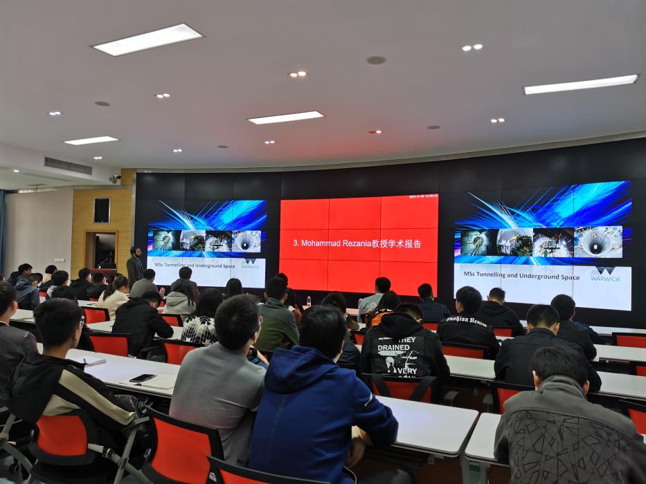 在聘任仪式结束以后,Mohammad教授以“Constitutive modelling of natural soil behavior, experimental verifications and applications”为题,进行了一场学术报告。在报告中,Mohammad教授首先对岩土本构模型由浅及深进行了讲解,阐述了传统岩土本构的缺点,再结合各向异性、时间独立性等因素对传统本构进行优化,以求反应真实的天然土体行为。在介绍完岩土本构模型之后,Mohammad教授就MPM物质点法在地质灾害模拟方面的应用、固结仪的优化处理、矿山修复、基质吸力测量等多个学术热点话题发表了自己的见解。最后,Mohammad教授介绍了华威大学的硕士课程,希望能够加强与蘑菇视频