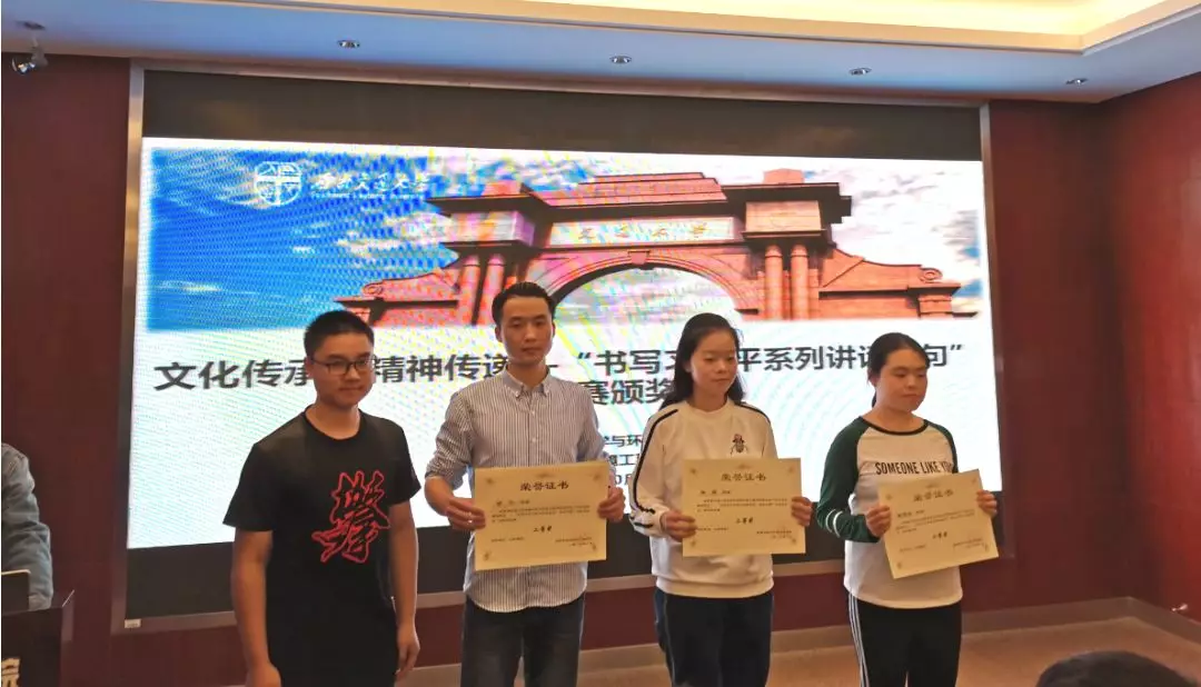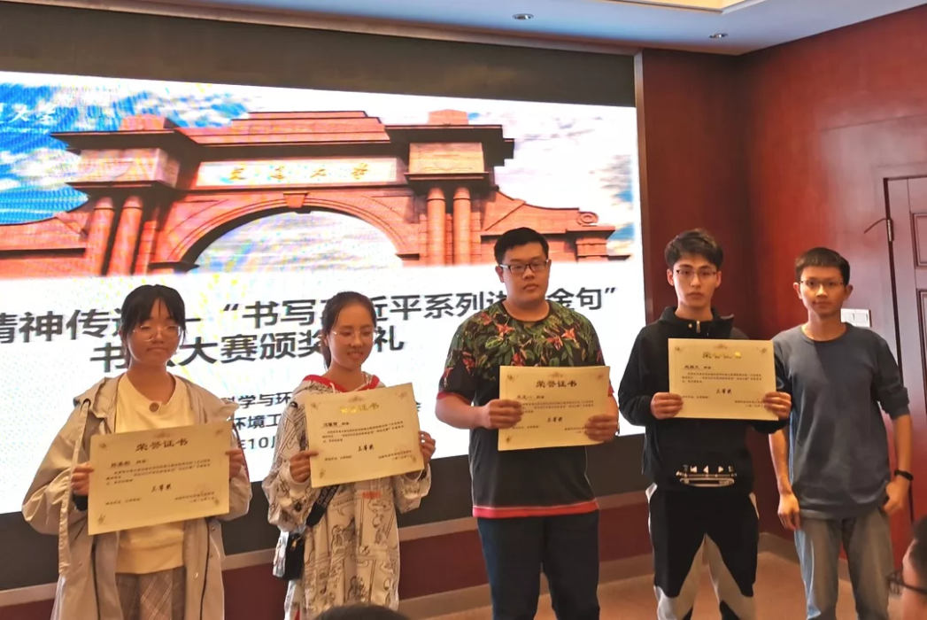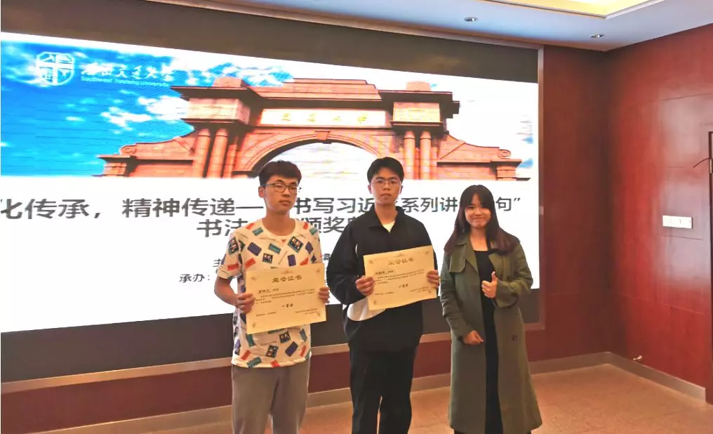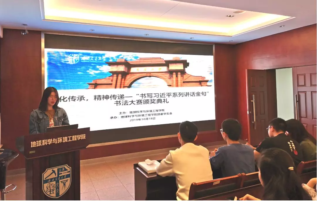 10月18日晚19:30,“文化传承,精神传递”书写习近平系列讲话金句书法大赛颁奖典礼在X4520举行。出席嘉宾有:学生会指导老师李国欣,地学学生会主席严榆凡,副主席潘越,副主席黄镜。