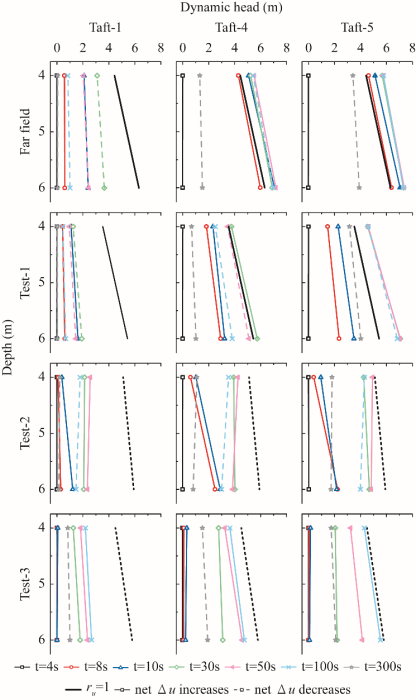 图2 小震、中震、大震作用下土芯内动力水头等时线图