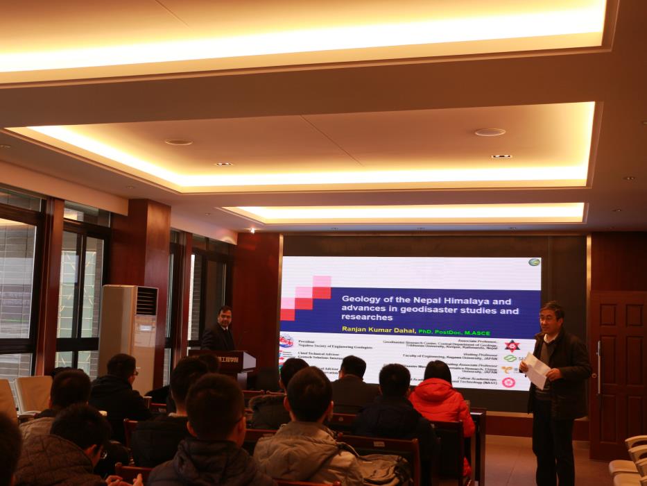 、土木学院等相关学科的博士与硕士研究生以及本科生。讲座开始之前,程谦恭教授代表参加讲座的全体师生向Ranjan Kumar Dahal教授表示热烈欢迎,并向参加讲座的各位老师和学生介绍Ranjan Kumar Dahal教授的学术成就。