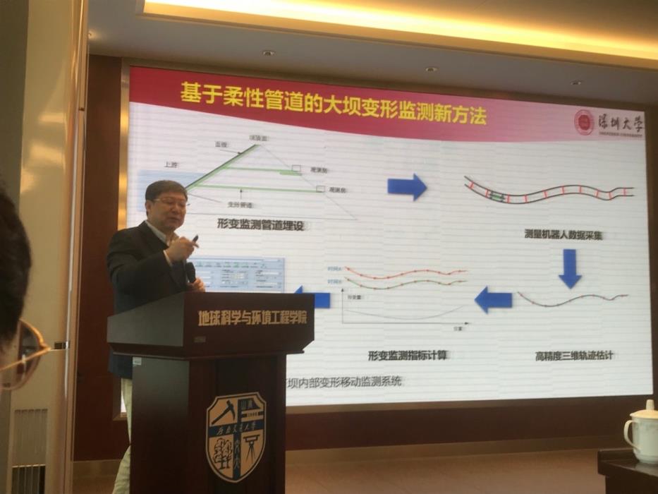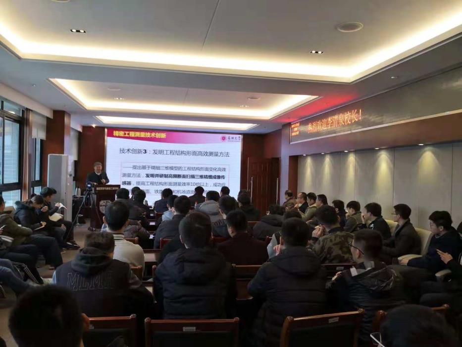 李清泉教授为师生们做了“精密工程测量技术创新与工程应用——工程结构形面动态精密测量”为题的学术报告,从精密工程测量项目的实际问题出发,创新性地提出了关键问题的解决思路和办法,并获得了开拓性的成果和专利:(1)所发明制造的拥有自主知识产权的车载多传感器集成智能路面监测以及大型激光动态弯沉测量系统,很好地解决了道路和隧道变形快速检测的问题;(2)首次解决了堆石坝变形监测的问题;(3)所发明的“管道胶囊”机器人系统地解决了由于地下管线破裂所造成的地面塌陷的难题;(4)系统性地论表述了精密工程测量未来的发展趋势。
