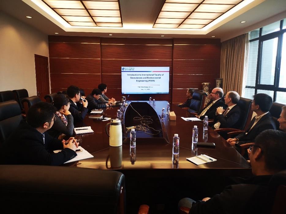 2018年10月29日下午,由美国爱荷华大学副教务长、国际项目部主管Downing Thomas教授带队,水利科学与工程系系主任Gabriele Villarini教授,政治科学系系主任Wenfang Tang教授,城市与区域规划学院研究生教育主管Haifeng Qiang教授一行四人来访地球科学与环境工程学院交流座谈。座谈会由我院院长刘国祥教授主持,我校建筑与设计学院院长Odgaard教授受邀出席。双方对各自学校的历史背景,学校与城市的关系,学院的教学科研方向、师资储备,以及国际合作等方面进行了交流和讨论。