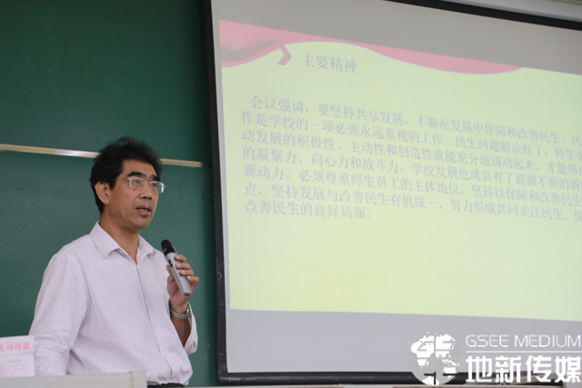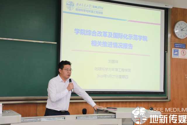 刘国祥对学院综合改革及国际化示范学院的情况进行了报告。刘国祥从学院目前取得的科研成果讲起,从学院的师资、人才等方面,对学院的学科排名和发展情况进行了分析,希望学院能够直面挑战,砥砺前行。刘国祥表示,学院与OSU消防工程合作办学的项目是前途无量的,是学院迈向国际化的重要举措。随后,刘国祥宣布了国地实验室科技转化平台已获新都区政府支持的消息,向在场老师介绍了基本情况,同时详细介绍了对新都区政府和学校提供的经费支持的使用计划。刘国祥表示,学院将会按照“整合资金,统筹兼顾,计划先行,持续执行”的原则,为全院教职员工营造温馨祥和的工作环境,取得更好的科研成果。最后,刘国祥介绍了地学国际化示范学院的建设计划以及已签订工作意向协议的外国专家。