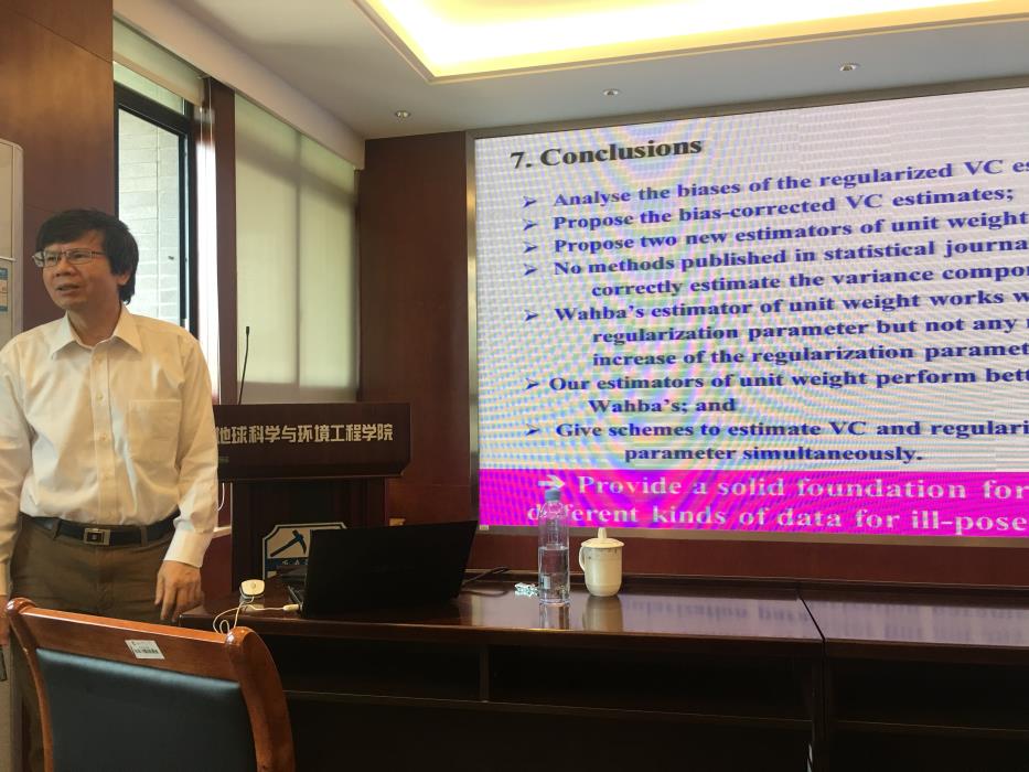 测绘系开展学术交流,并在X4520做了题为“Combining different kinds of data in linear inverse ill-posed models”的学术报告。会议由范东明教授主持,熊永良教授、周乐韬、龚晓颖、田玉淼、游为等老师、西南石油大学苏勇老师、测绘系部分本科生、研究生和博士参加了本次报告会。徐培亮老师分析了由于系统的不稳定,导致现有病态问题的方差分量估计并不能用传统的赫尔默特方差分量估计方法进行求解的问题,并提出了新的计算方法,通过重力场反演等算例验证了新方法的有效性和可靠性。报告结束后,老师同学们就截断奇异值的病态问题解算、地震波反演、整周模糊度解算、星间链路方差分量估计等问题与徐老师进行了深入交流探讨。老师同学们都表示徐老师深入浅出的讲解让大家受益匪浅,并从世界顶级科学家的经历中学到了应如何从事研究,从事什么样的研究等方法和经验。