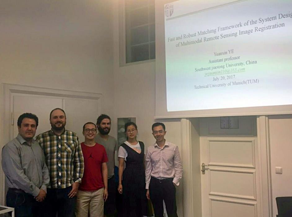 教师叶沅鑫博士于2017年7月20日到德国航天局和慕尼黑工业大学做主题为光学和雷达影像自动快速精确匹配的学术报告。