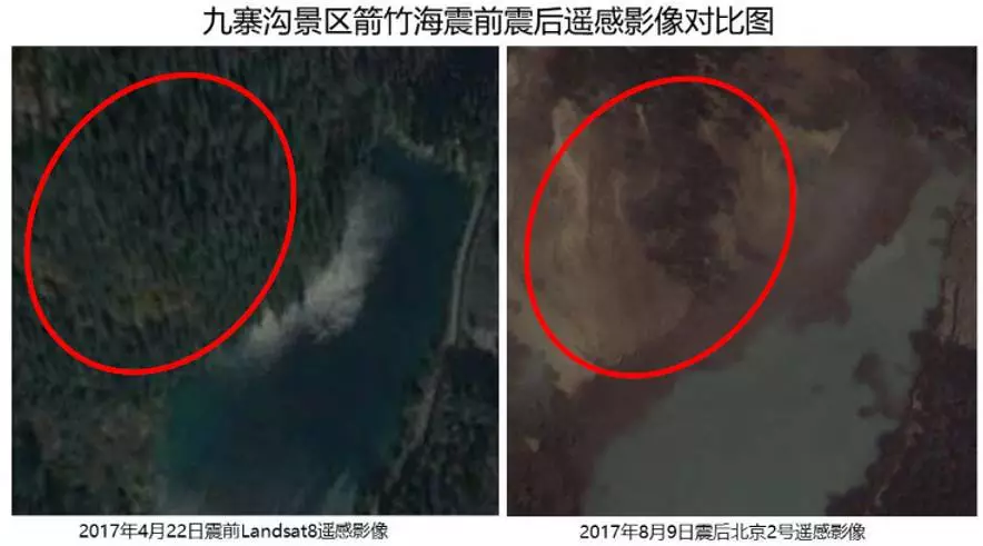 ▲图5. 九寨沟景区火花海震前震后遥感影像对比(震后水面浑浊,部分水域干涸见底)