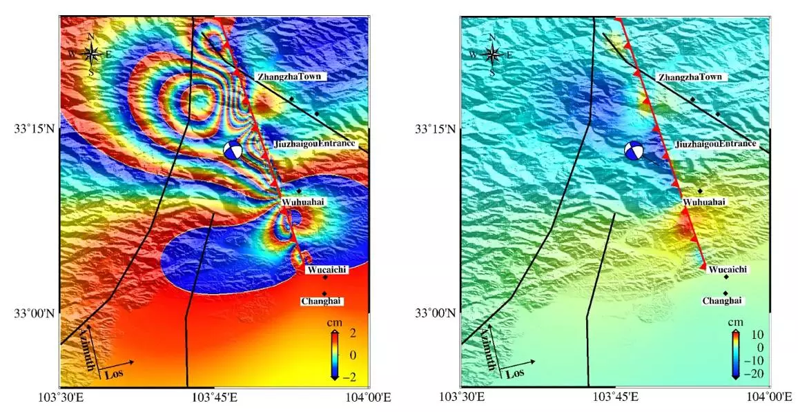 和西南石油大学从事遥感研究的专家学者和博士生组成的专门工作组,成员包括陈强教授、杨莹辉博士、王晓文博士、张瑞博士、贾洪果博士、于冰博士和博士生武帅莹、蔡嘉伦、师悦龄、徐倩、张一君、刘先文以及硕士生赵雪、梁清粼等,由刘国祥教授做总体技术负责与工作安排。工作组主要使用高分辨率光学遥感和合成孔径雷达干涉(InSAR)遥感等技术对地震所造成的大范围地表位移、景区损毁和滑坡情况等进行了监测与分析,并对此次地震滑动断层的几何物理模型进行了反演与分析。