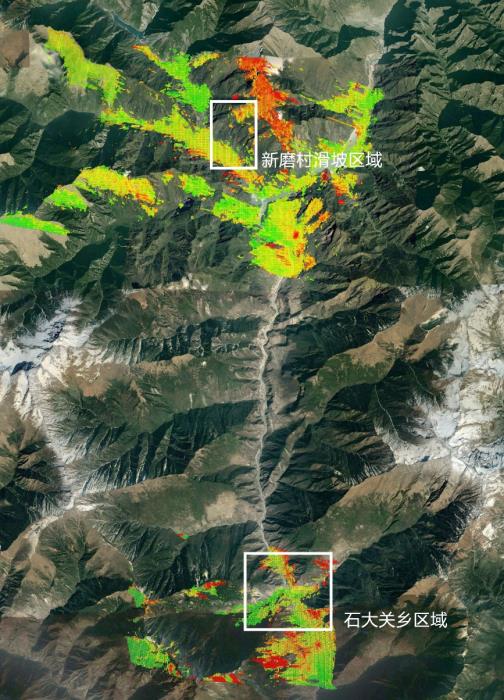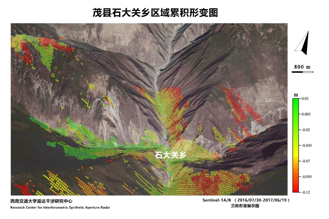 与此同时,我院刘国祥教授领导的InSAR研究团队立即启动茂县相关滑坡位移时序计算与分析,持续下载2016年7月至2017年6月间多幅存档卫星SAR影像数据,基于合成孔径雷达干涉(InSAR)时序分析技术开展了大量的数据处理,得到了过去一年内茂县相关滑坡体表面每隔12天的位移累积量及其时间序列,相关结果已提交给参与现场救灾和灾情评估工作的有关专家。在分析叠溪镇新磨村滑坡区域及其周边范围内近一年的历史形变数据的同时,在石大关乡区域(距新磨村滑坡约18.5公里的)也探测出了较大位移量的不稳定滑坡体。下图陈述了新磨村和石大关滑坡的位置及其在2016年7月至2017年6月间的坡体表面位移累积形变及时序形变结果。