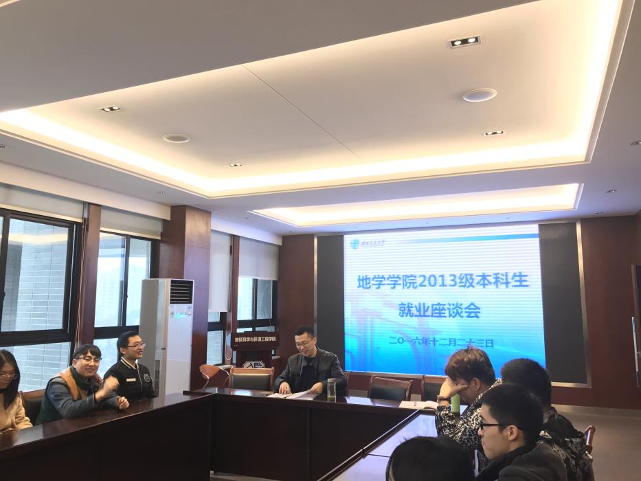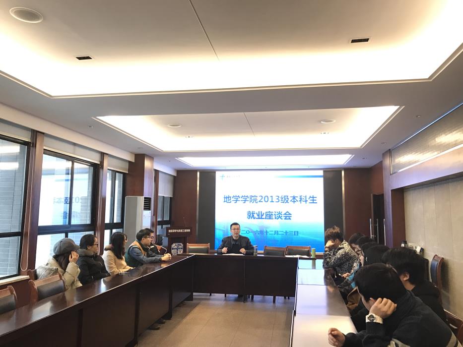 党委副书记傅尤刚主讲。参加本次座谈会的有2013级地质、地信、遥感专业未就业学生,以及相关辅导员老师。