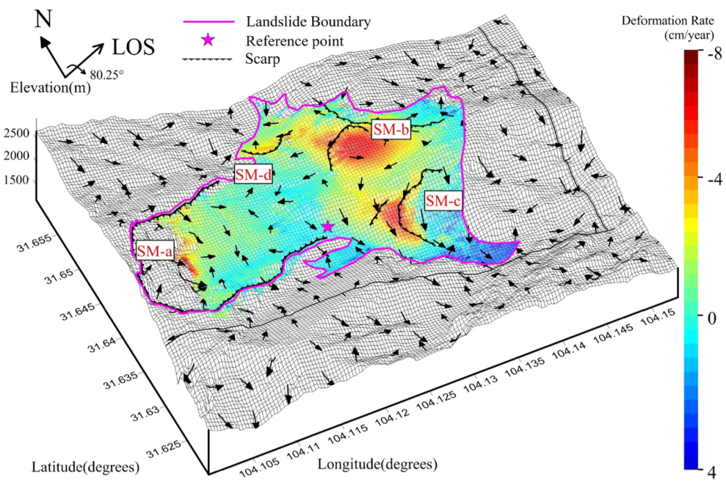 刘国祥教授联合指导下完成的。2014年7月至2015年9月,戴可人同学曾在英国纽卡斯尔大学进行联合培养并开展合作研究。该研究针对世界级特大滑坡——大光包滑坡(属2008年汶川大地震引发的龙门山断裂带最大滑坡体),使用德国TerraSAR-X/Tandem-X姊妹卫星所获取的高分辨率SAR影像和欧洲空间局新近发射的Sentinel-1卫星所获取的SAR影像时间序列,基于InSAR及其时序分析方法进行了滑坡体数字高程模型计算与滑坡时空形变信息提取与分析。顾及大光包滑坡的特殊成因和Sentinel-1 TOPS获取模式沿卫星飞行方向存在多普勒频移等问题,该研究提出了基于InSAR分析的巨型滑坡体体积计算方法和适用于Sentinel-1 TOPS数据的形变时间序列计算方法,有效解决了最新Sentinel-1 TOPS影像数据的配准难题,率先得到了基于多幅Sentinel-1 SAR影像的时序形变分析结果。研究结果表明,汶川大地震引起大光包滑坡迁移体积达到1.189×10^9立方米;尽管汶川大地震灾难已经过去了8年的时间,大光包滑坡仍存在多处形变活跃区域,最大滑坡位移速度达到8厘米/年(如上图所示,引自所发表的论文)。