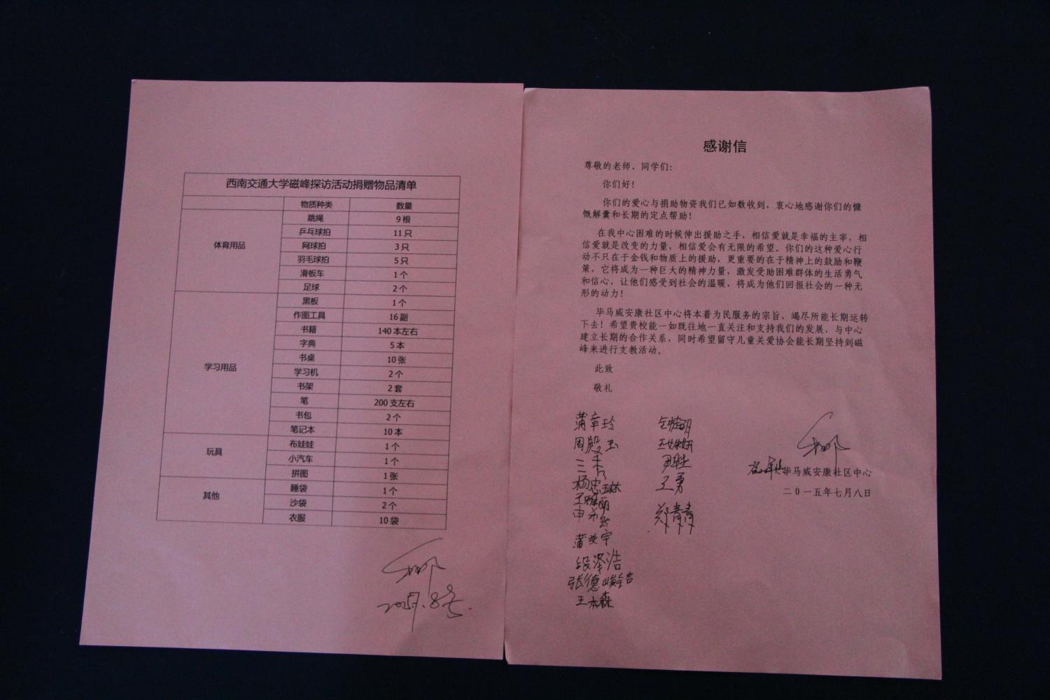 本次捐助的物品有儿童玩具、书籍、衣物、文具、体育用品、帐篷等,是近期机关党委在大学、附中和小学分别发出倡议之后,老师们和同学们纷纷大力支持捐献的。捐赠仪式上,磁峰镇毕马威社区关爱中心负责人牛娜对西南交大机关党委、机关工会以及学院志愿者们长期以来坚持不懈的对口帮助表达了感谢,并代表小朋友们送上了感谢信。当孩子们从老师手中接过这份浓浓的情意时,他们脸上绽放出了灿烂的笑容。