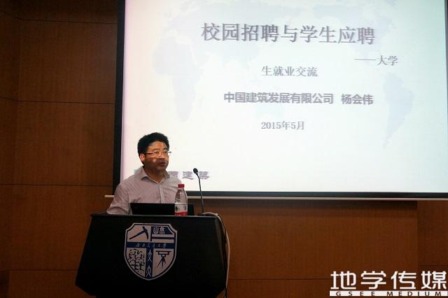 讲座伊始,傅尤刚副书记致欢迎辞,表达了对杨会伟总经理的热烈欢迎,也介绍了在新一季毕业生招聘又将开始的时间节点开展就业指导讲座的重要意义——为大学生就业提供简历制作、面试的经验,助力学子求职就业。其后,杨会伟上台进行经验交流。首先他介绍了其就职的中国建筑发展有限公司的大致情况,其后,他提到了就业压力,2015中国大学毕业生有749万人,就业形势十分严峻。与此同时他分析了现在中国的经济现状,工业回落,投资形势好,诸多高科技行业快速发展,智慧城市风靡全国,走出去、国际化战略进行地如火如荼。但是劣势依然存在,新的经济动力尚未形成,经济增长持续下行,“房地产化”经济难以快速扭转。