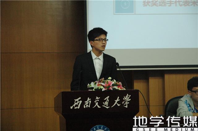 最后一位上台发言的是参赛选手代表宋闯同学。宋闯同学从“科技月能给我们带来什么”,“自己参加科技月活动”这两个方面谈论自己的感悟,并对以后的科技月活动寄予高度期望,希望科技月能够走出学院,走向全校,吸引更多学生参加。