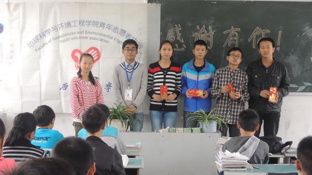 青川县是“5.12”地震的重灾区,五年前的灾难给予了这个原本就贫困的县城沉痛的打击。志愿者们为此专门走访了青川县的沙洲中学。当了解到这些孩子平时基本没有课外读物,志愿者们特地用大家捐献的军训服获得的资金购买了一批图书送给沙洲中学的孩子们。此外,青协还用这笔资金作为助学金发放给一些品学兼优,但家庭条件困难的同学。青协会长李小龙鼓励同学们好好学习,成功成才,将这样的志愿者精神传承和发扬下去。除了沙洲中学的同学们,志愿者们也给一些农民工一些衣服和鞋子,给予他们力所能及的帮助。