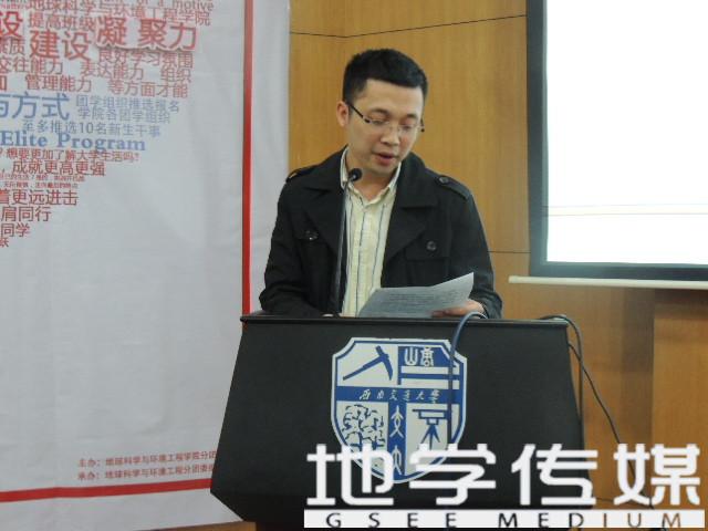 接着地学党委副书记傅尤刚老师为本次典礼致开幕词,宣布第三期“菁英计划”团干培训正式开班,傅尤刚老师在致辞中希望“菁英计划”能为学生搭建一个成长、成才的平台,希望同学们通过学习能对个人能力的培养、工作技能的提高、班团委的建设起到一个积极的促进作用,希望同学珍惜此次培训计划,并预祝本期“菁英计划”取得圆满成功。