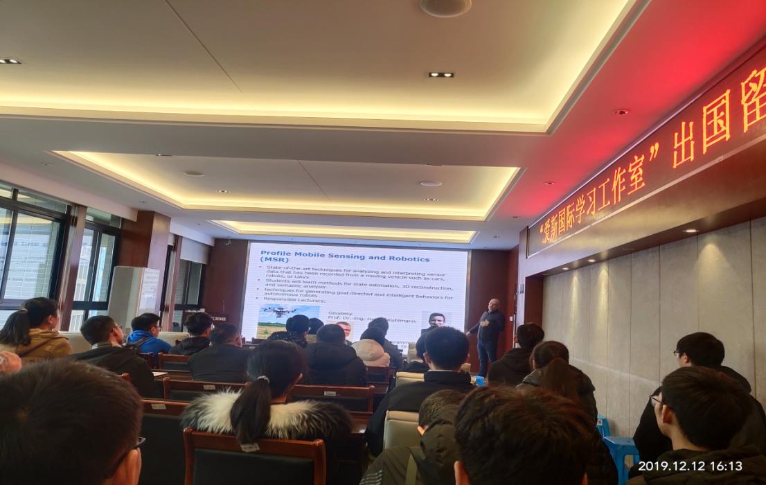 活动伊始,先由Lutz Pluemer教授就波恩大学测绘专业的优秀教授、前沿的研究方向、学校在世界和欧洲的排名以及硕士的课程向大家进行展示。他提出,作为当代杰出大学生,我们必须时时刻刻追求更高层次的教育,他向大家介绍了申请该名额的条件,强烈鼓励大家用于尝试。