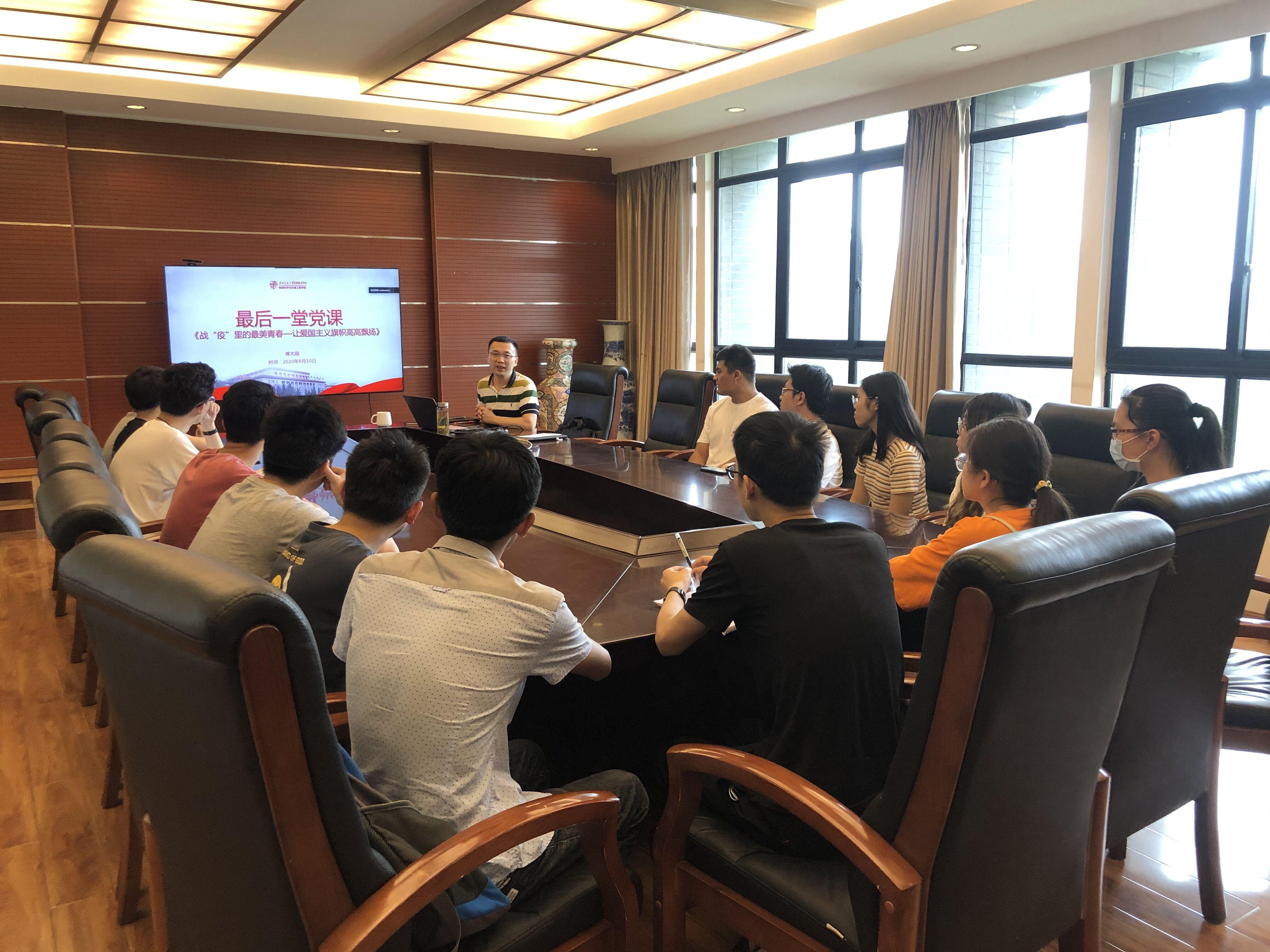党委副书记傅尤刚以“战疫里的最美青春—让爱国主义旗帜高高飘扬”为题,通过线上线下联动的方式为2020届毕业生做“建功立业新时代”——职前价值塑造班会,其中本16级党支部在X4531线下参与,其余毕业生通过腾讯会议线上参与班会。