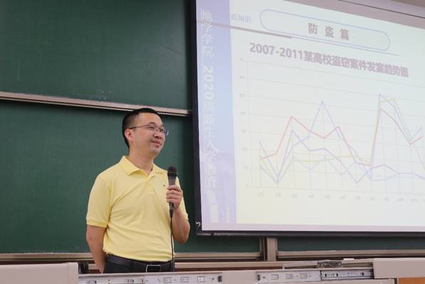 傅尤刚在安全教育开始前与同学们进行了亲切的交谈,他嘱咐大家要继续关注疫情,自觉佩戴口罩和保持一定距离,降低疫情传播风险。随后,他按照大学进行安全教育的客观要求,即大学环境、社会发展、社会法制建设和经济发展这三个要求,一一为同学们细致讲解。其中,他在讲解防盗、防骗、防人身伤害、交通安全、防火安全和防震安全六个方面的安全知识时,通过大量的图片和数据,详细直观地告诉同学们大学生活中安全防范的重要性。他告诫同学们要修身律己、遵纪守法,同时也要时刻保持警惕、关注安全,不让违法分子有可乘之机。