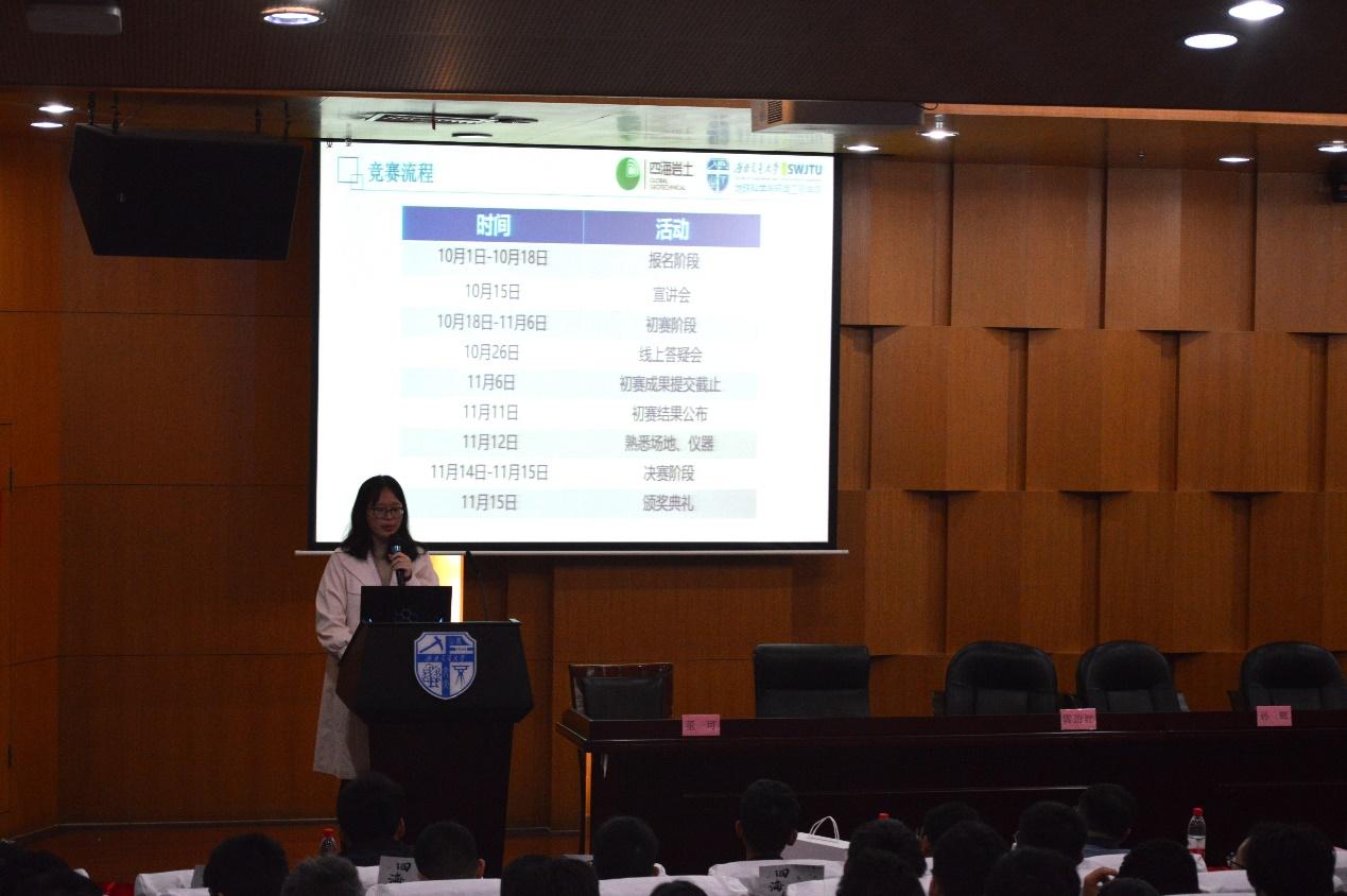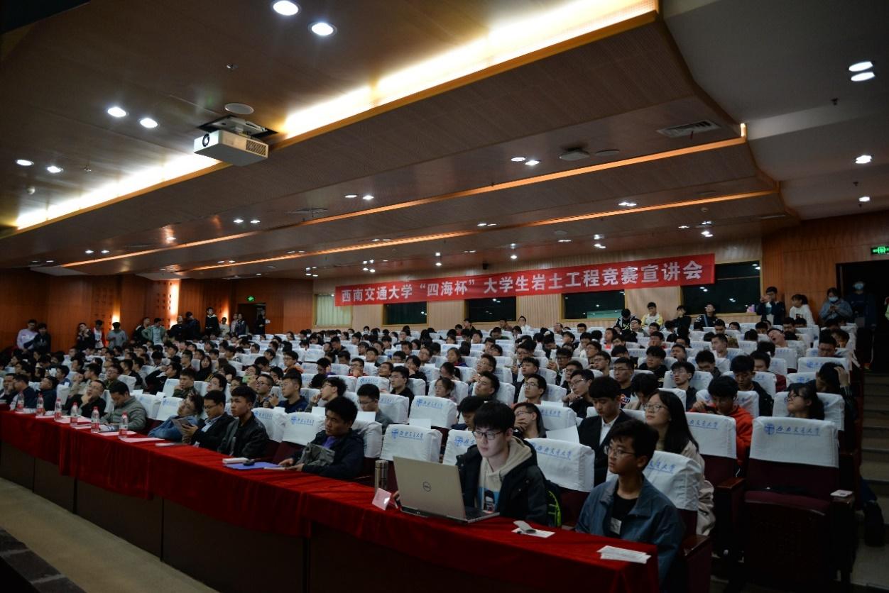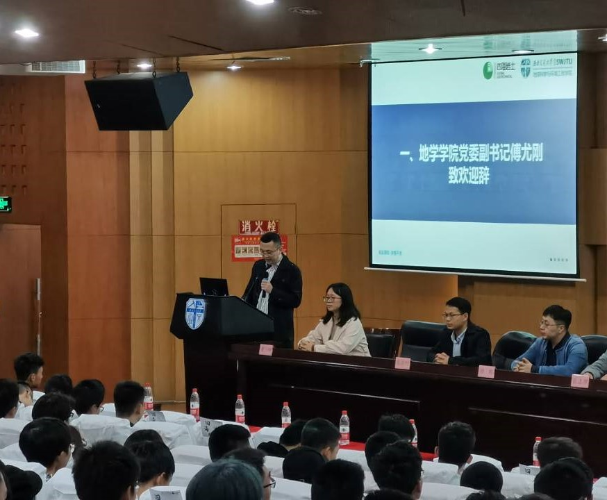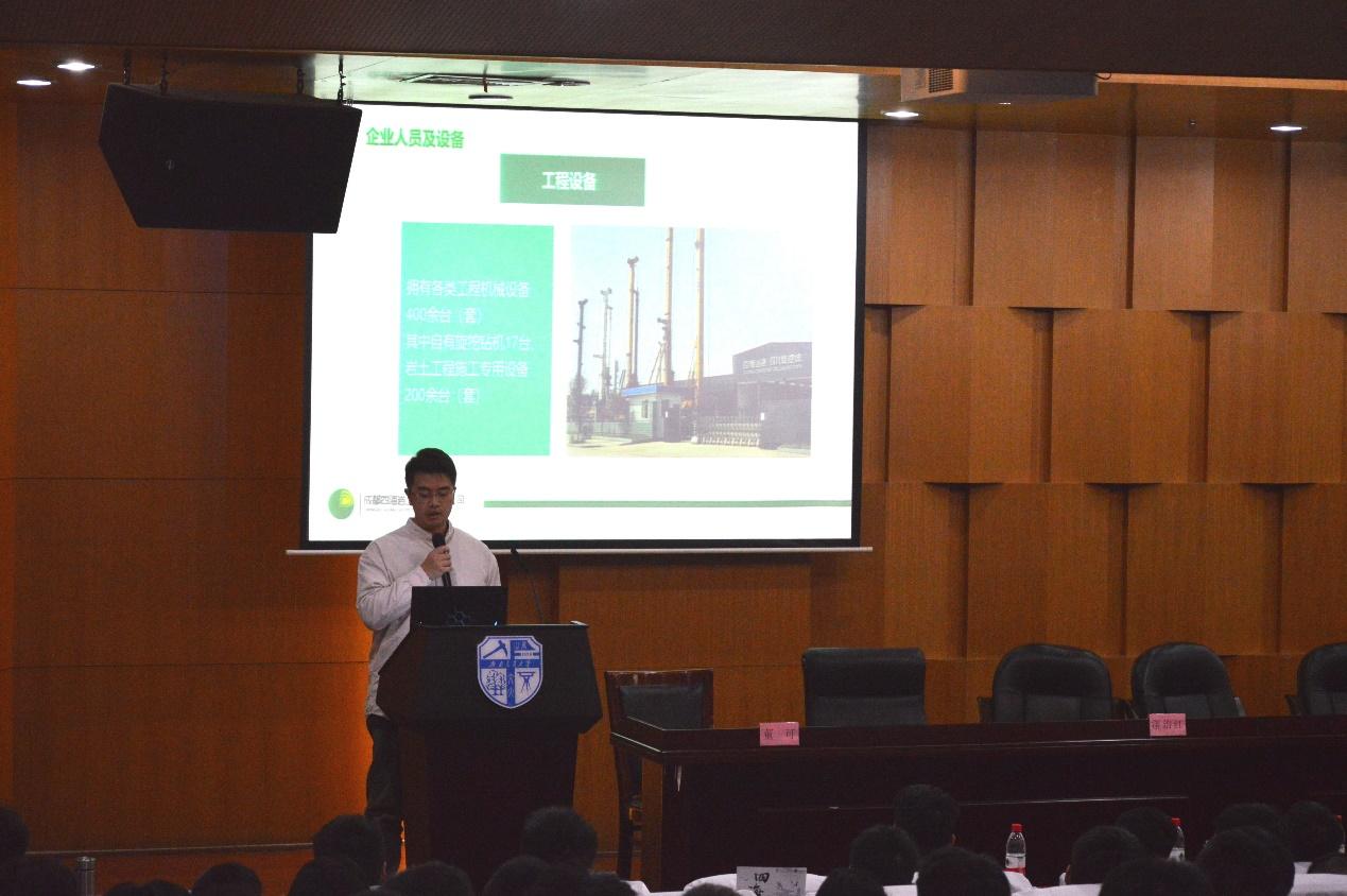 联合成都四海岩土工程有限公司于图书馆二号报告厅举办大学生岩土工程竞赛宣讲会。四海岩土工程有限公司副总工程师李明、人力资源总监徐艺、工程师陈挺、蘑菇视频