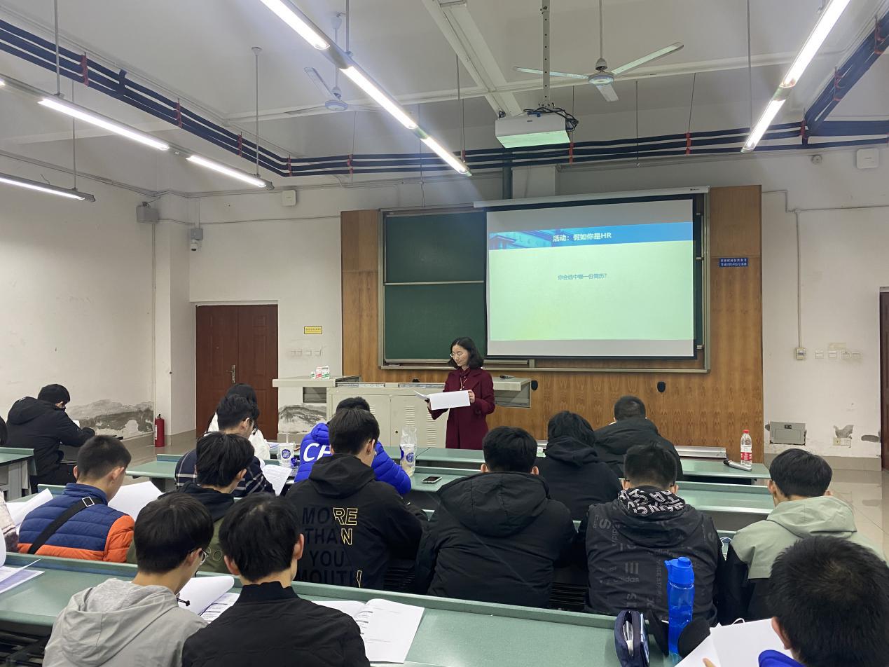 马老师首先提出基于HR视角的简历制作概念,并依次展开讲解了HR如何筛选简历,简历制作背后的逻辑,以及掌握简历制作的原则。她从多方面举例,图文并茂,逐步讲解简历制作流程和细节,并手把手教同学们现场试着制作一份优质简历。同学们认真聆听和学习。