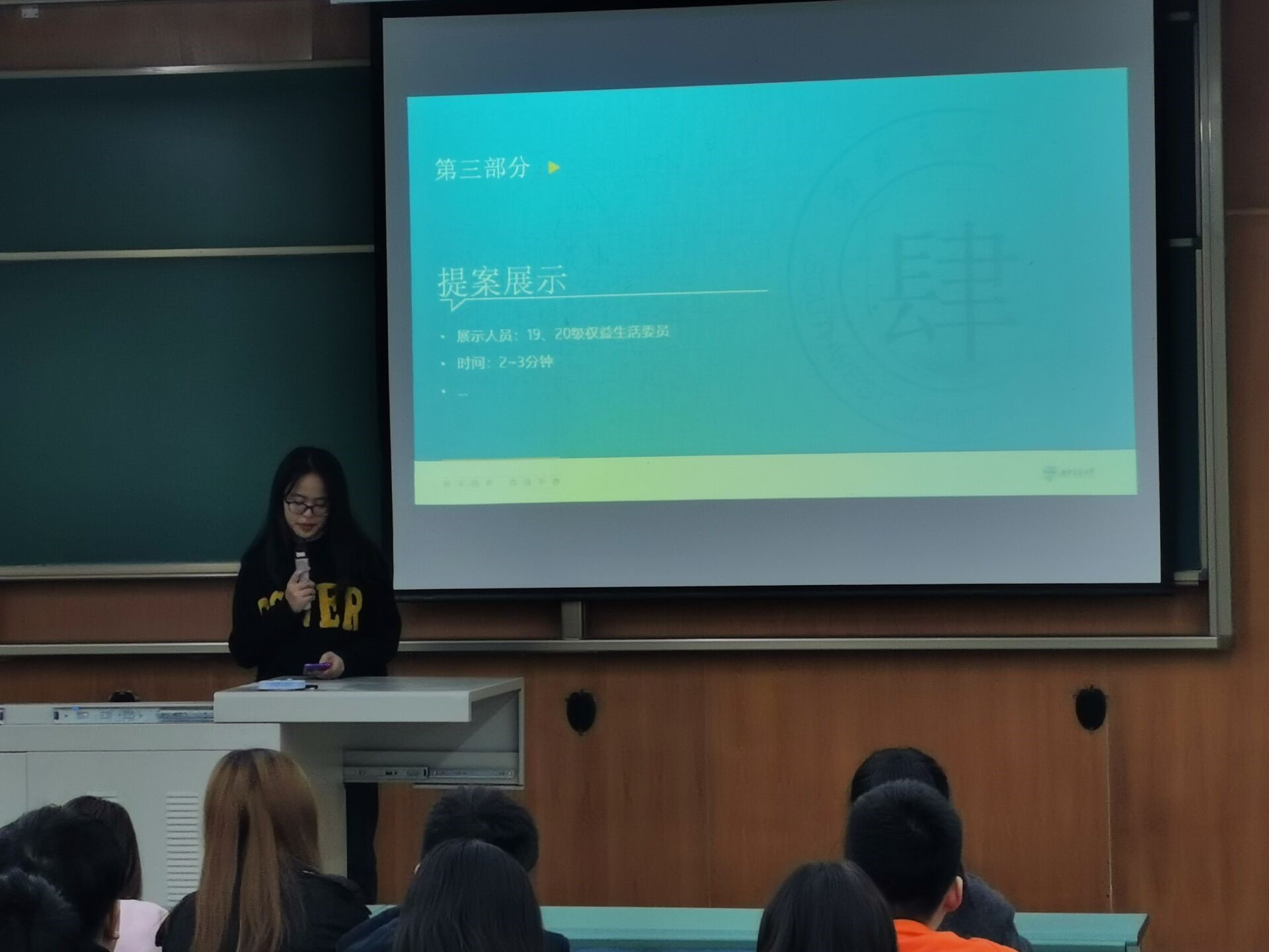 最后,由权益与生活委员们展示了优秀提案,学生会主席霍东峰也就部分提案给出了建议