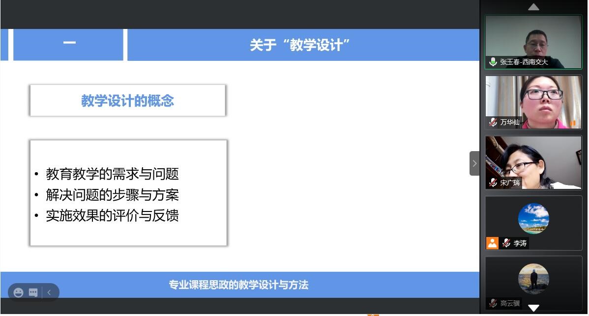 其次,张玉春副院长从关于“教学设计”、专业课程思政教学设计的“五个环节”、如何设置专业课程思政目标、专业课程思政内容的选择和融入路径、开展专业课程思政的方法、思政目标与专业课程的融合的标准、如何进行引导、如何进行评价、各级领导层面可以做的工作、相关专业课程思政实例等10个方面分析了专业课程融入思政工作的教学设计理念与方法。
