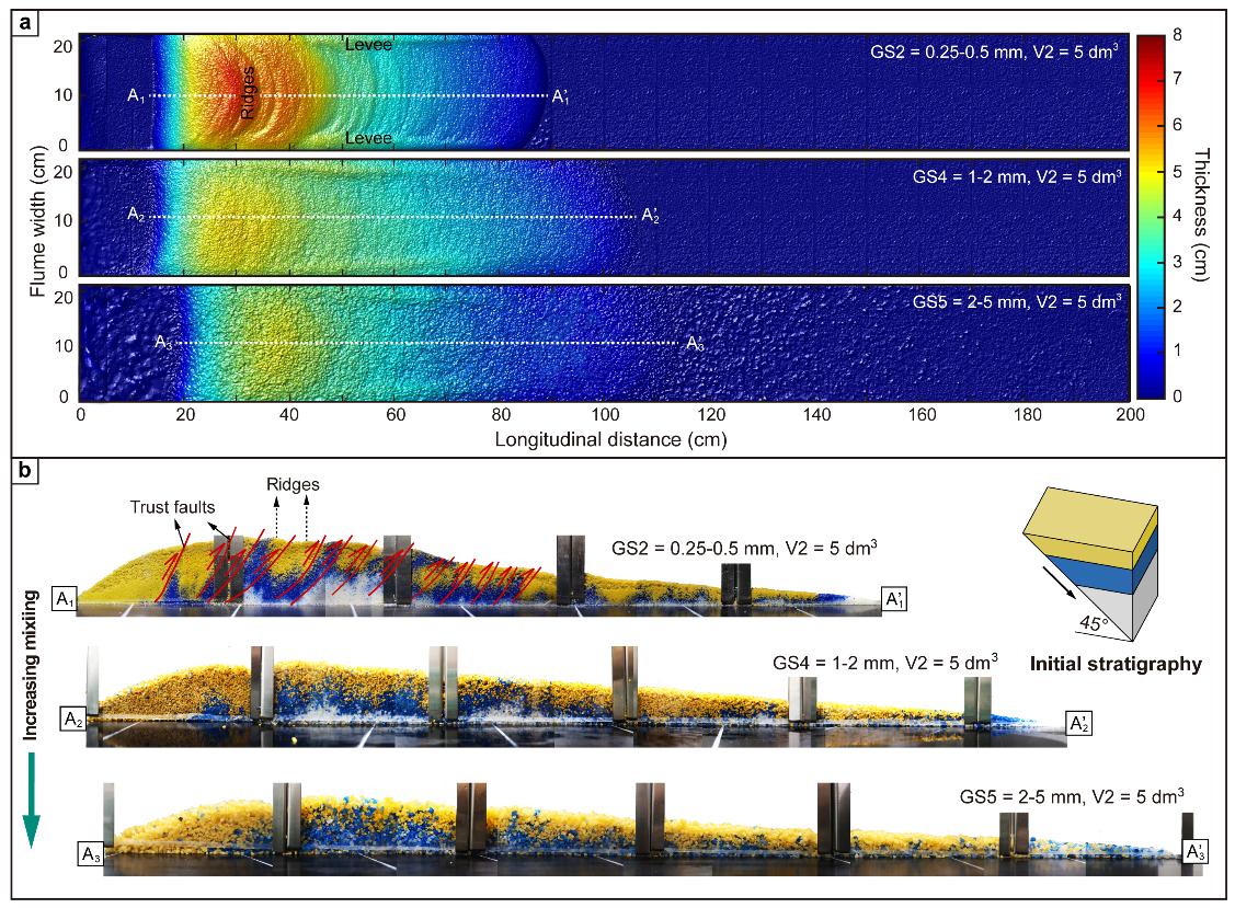 (4)颗粒流的粒径和体积是决定颗粒流流态的关键因素,随着粒径的减小和体积的增大,颗粒流由惯性态(inertia flow regime)向密集态(dense flow regime)过渡,颗粒间相互作用由碰撞主导转变为持续的摩擦接触,颗粒流连续性加强、内部扰动减小;颗粒流由惯性态向密集态的转变促进了颗粒流堆积体中源区层序保留、表面流态化地貌特征等的发育(图5)。