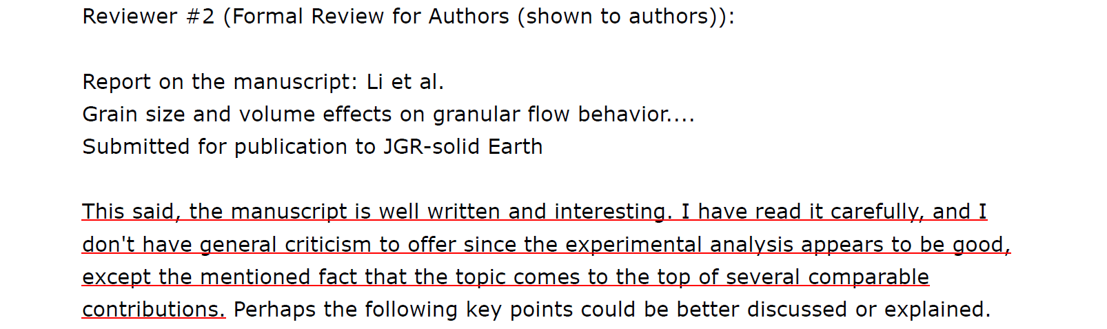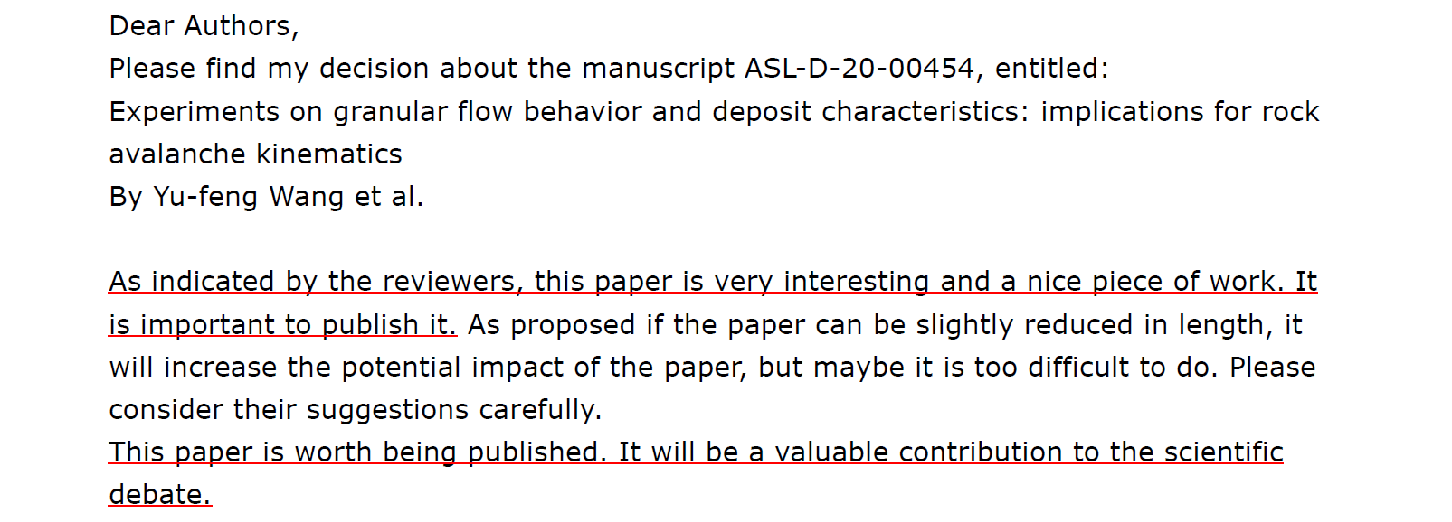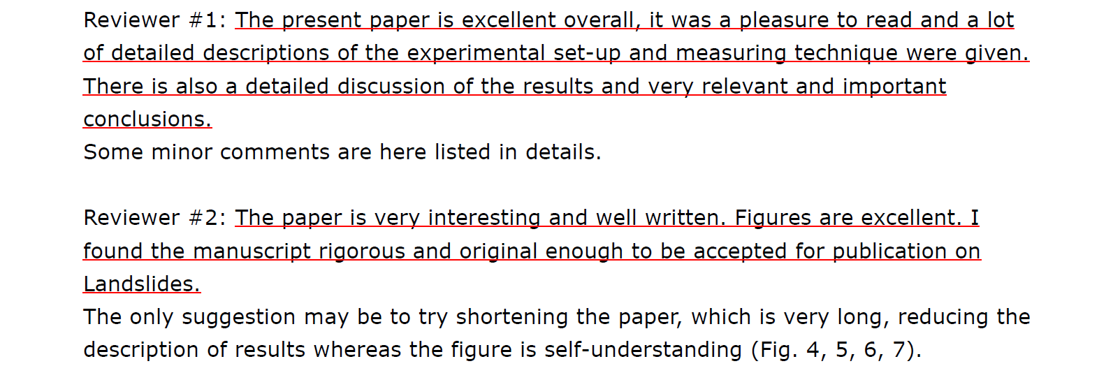 这一长达21页的研究论文,近期发表在国际工程地质和地质灾害领域著名期刊《Landslides》。由于该项成果中研究手段的先进性及研究问题的前瞻性,获得了审稿人及主编的高度评价(图7):“本论文总体非常出色,对许多实验设计及监测方法进行了详细地说明,并得出了非常相关和重要的结论;这篇论文很有趣,写得很好,图件非常出色,其严谨性和原创性足以在Landslides期刊上发表;论文的研究主题在一些可比性较高的研究中其贡献是最为突出的(the topic comes to the top of several comparable contributions);论文非常值得发表,它将为科学的辩论做出有价值的贡献……”