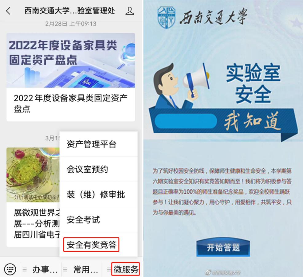 参与答题方式一:扫描二维码关注资产与实验室管理处微信公众号,选择“微服务”—“安全有奖答题”