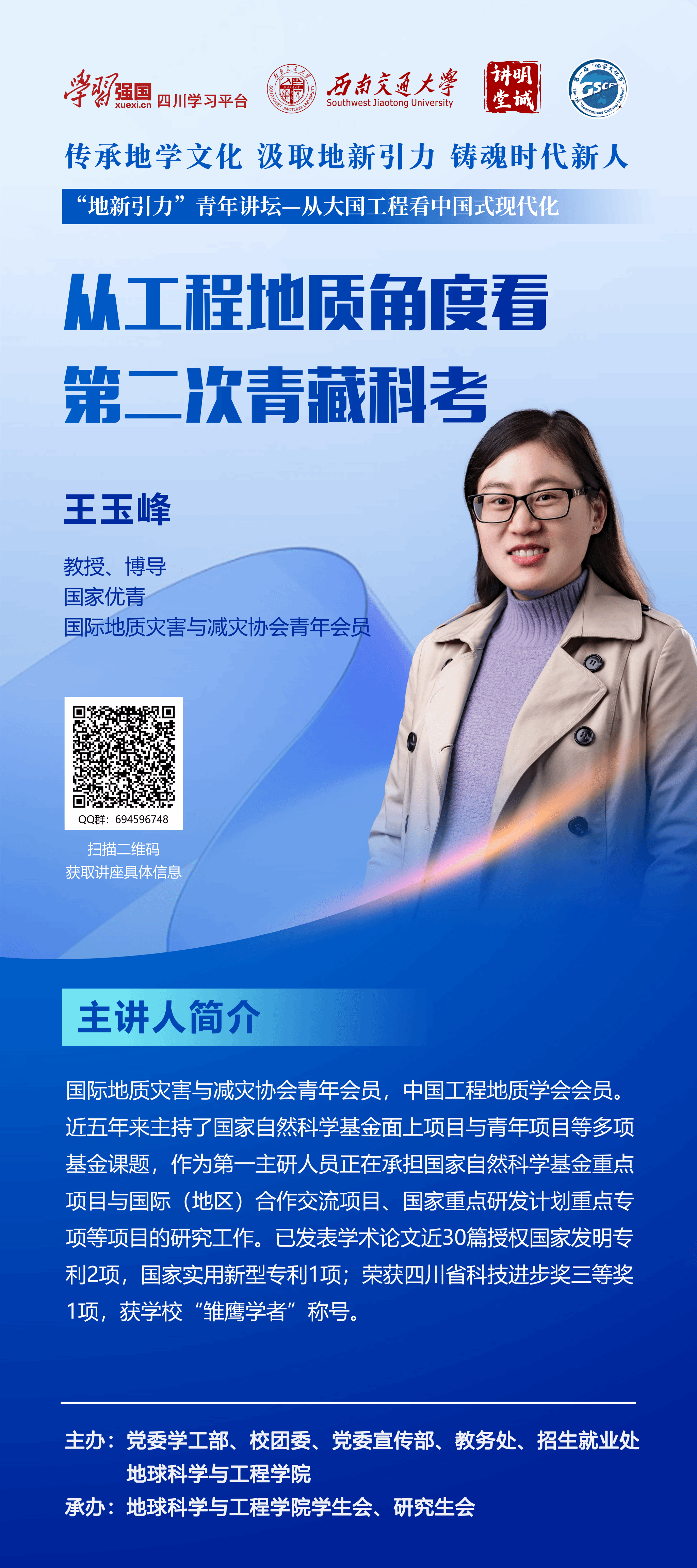 主讲人简介:现任国际地质灾害与减灾协会青年会员,中国工程地质学会会员。近五年来主持了国家自然科学基金面上项目与青年项目等多项基金课题,作为第一主研人员正在承担国家自然科学基金重点项目与国际(地区)合作交流项目、国家重点研发计划重点专项等项目的研究工作。已发表学术论文近30篇授权国家发明专利2项,国家实用新型专利1项;荣获四川省科技进步奖三等奖1项,获学校“雏鹰学者”称号。