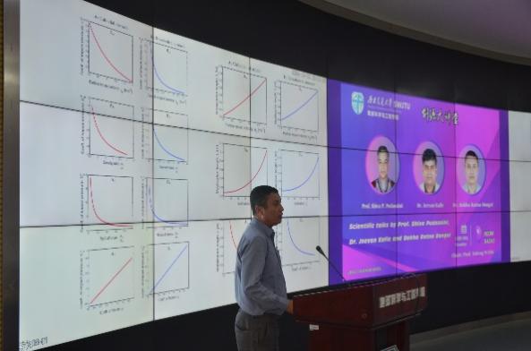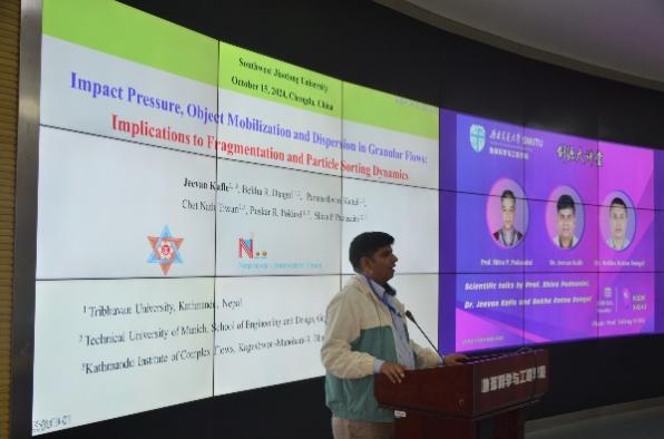 此后,Jeevan Kafle助理教授和Bekha Raina Dongol博士作了题为“Impact Pressure, Object Mobilization and Dispersion in Granular flows: Implication to Rock-avalanche Fragmentation and Particle Sorting Dynamics”的学术报告。Dongol博士首先介绍了冲击力系数(impact force coefficient)的概念,展示了使用物理模型试验验证新模型的思路,探讨了其在工程中的实际应用。Kafle博士提出了一种新的非线性频散波方程(non-linear dispersive wave equation),用于统一描述滑坡运动中的流体深度和流速,并讨论了其应用潜力。