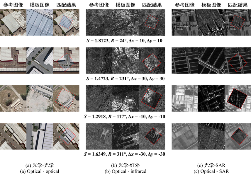 课题组受国家自然科学基金(42271446)资助发表了题为《一种旋转和尺度不变的异源景象匹配方法》的论文,第一作者为彭韬硕士研究生,叶沅鑫教授为通讯作者。该论文针对异源图像对之间非线性辐射失真和几何变形导致的难以实现匹配的问题,提出了一种具备旋转和尺度不变性的异源景象匹配方法以同时估计异源图像对之间的旋转、尺度和位移变化。首先利用图像局部的位置关系构建结构特征,再结合对数极坐标变换将图像整体的旋转和尺度变化量正交展开并在笛卡尔坐标系上表示,最后,根据位移量构造五维特征描述符,并利用高维相位相关方法实现图像匹配,实验表明,所提出方法可实现任务旋转和4倍以内的差异的可见光、红外、SAR等多种异源图像的匹配。