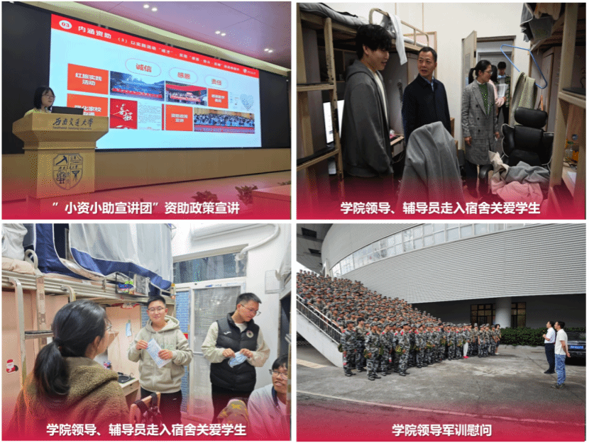 学院秉持“以学生为中心”理念,全方位保障新生健康成长。一是做好资助育人,邀请学校“小资小助宣讲团”开展资助政策宣讲,覆盖家庭经济困难认定、勤工俭学、奖助学金评审等内容,确保政策知晓全覆盖。二是深化一线关怀,学院领导、辅导员走入宿舍、课堂、操场等生活区域,精准掌握新生适应情况,及时回应解决困惑。三是强化情感联结,开展军训慰问并发放物资,让新生在关怀中增强归属感与幸福感。
