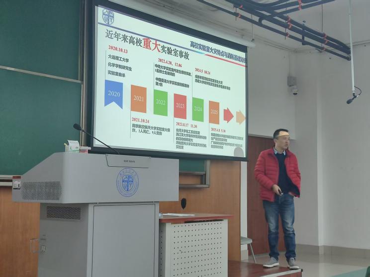 实验室安全管理工作”为主题展开讲解。她首先从国家层面对高校实验室安全管理的要求出发,阐述了安全管理的政策依据与重大意义,随后详细介绍了我校在实验室安全管理方面的具体工作,涵盖危险化学品、气瓶、压力容器等重点环节的管理制度与操作规范。吴老师结合近年高校实验室安全事故案例,剖析了身边常见的安全隐患,并强调规范操作与日常检查的重要性。最后,她介绍了我校开展的各类实验室安全教育宣传活动,鼓励师生积极参与,共同筑牢校园安全防线。